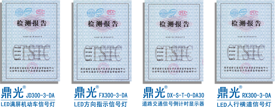 鼎光 交通信號燈符合《GB14887-2011道路交通信號燈》標(biāo)準(zhǔn),并且通過公安部交通安全產(chǎn)品質(zhì)量監(jiān)督檢 測中心檢測(最新檢測公交檢【委】第2012453-57號),生產(chǎn)、服務(wù)通過ISO9001國際質(zhì)量體系認證。