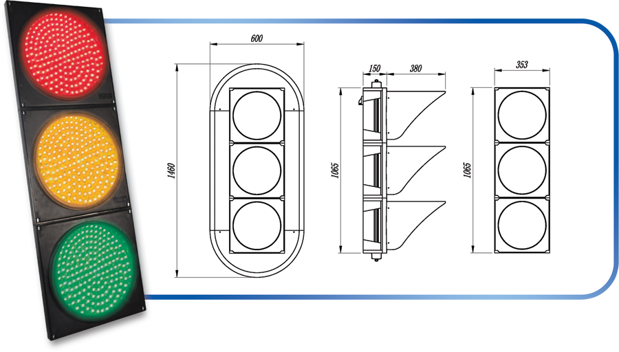 鼎光 JD300-3-DA LED滿屏機動車信號燈采用LED發(fā)光方式,符合國標(biāo)《道路交通信號燈》(GB14887-2011)的要求, 并且通過了公安部交通安全產(chǎn)品質(zhì)量監(jiān)督檢測中心的檢測。交叉口信號燈按車道功能設(shè)置,每組信號燈為具有可顯示紅、黃、 綠三色箭頭燈和全屏燈功能的燈具,安裝附于車道下游的懸臂桿或立柱式燈桿上,燈桿基礎(chǔ)必須安裝地線,接地電阻小于或等 于10歐姆。